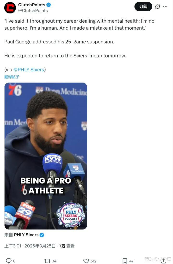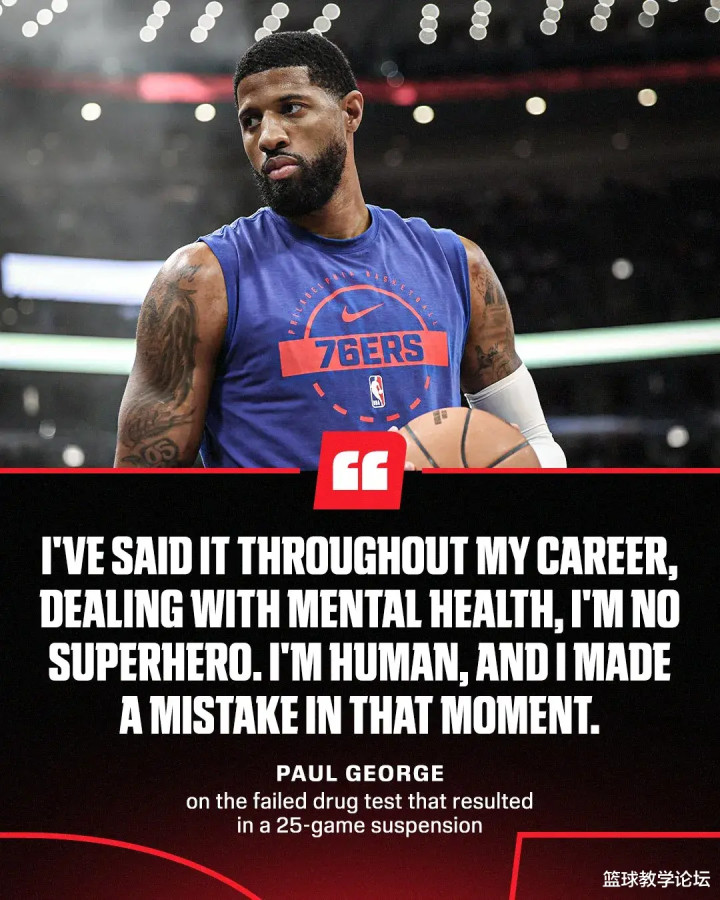 本年2月1日,NBA官方文书,乔治因违背定约禁药策略,被定约禁赛25场。那时乔治默示,为了诊疗格局健康,我方误服了定约违纪的药物。今天乔治再次恢复:“我不是超等袼褙,我仅仅个庸俗东谈主。而那一刻,我犯了个间隙。”