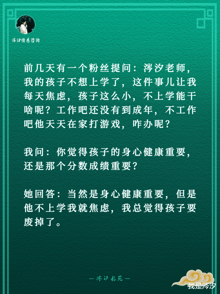 前几天有一个粉丝发问:涔汐教师,我的孩子不念念上学了,这件事儿让我每天张惶,孩子这样小,不上学醒目啥呢?责任吧还莫得到成年,不责任吧他天天在家打游戏,咋办呢?我问:你以为孩子的身心健康伏击,如故阿谁分数收获伏击?她回复:固然是身心健康伏击,然而他不上学我就张惶,我总以为孩子要废掉了。