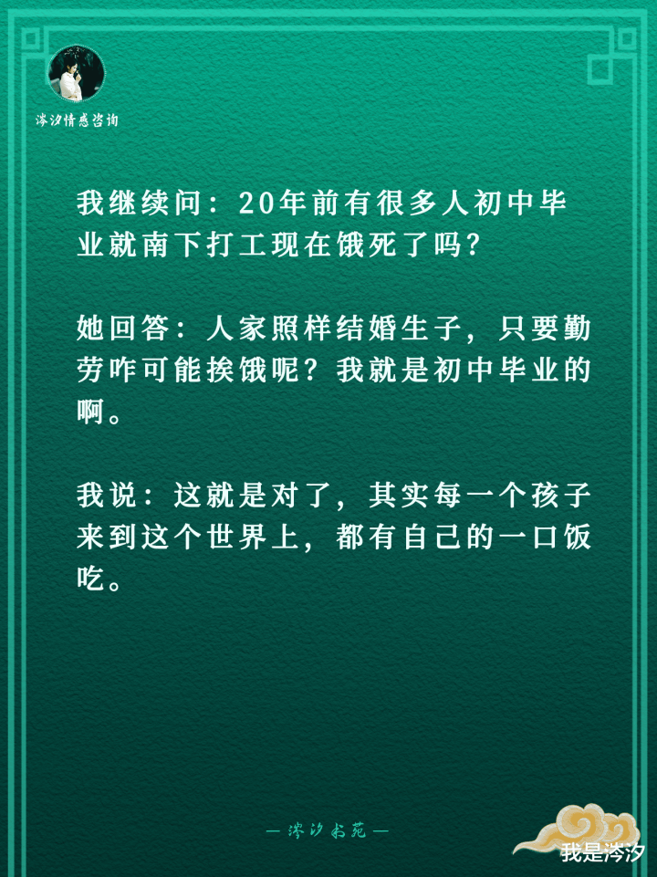 我络续问:20年前有好多东谈主初中毕业就南下打工现时饿死了吗?她回复:东谈主家照样受室生子,只有粗重咋可能挨饿呢?我等于初中毕业的啊。我说:这等于对了,其实每一个孩子来到这个宇宙上,齐有我方的一口饭吃。