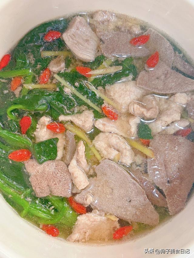 小贴士: 这说念汤负责快,猪肝和枸杞叶都不宜久煮,不然猪肝会老,枸杞叶会发苦。