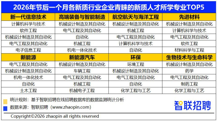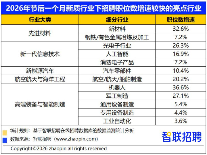 从智联招聘平台监测数据看,2026年春节后一个月,8大新质分娩力行业中,先进材料、新一代信息技能、新动力汽车、航空航天与海洋工程、高端装备与智能制造等技能链条靠前的行业职位数同比增速阐述卓绝,成为吸纳东说念主才的关键鸿沟。