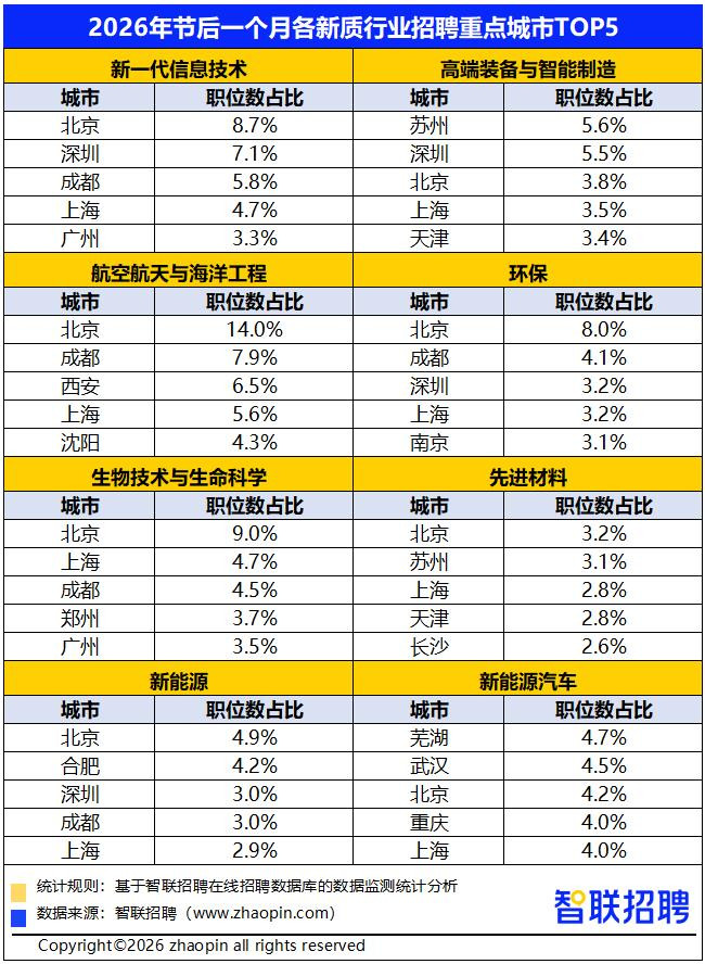 2026年节后一个月,北京在8大新质行业均参加东说念主才需求前三,上海在8大行业均参加前五,深圳则在新一代信息技能、高端装备与智能制造、环保、新动力等4个行业参加前三。