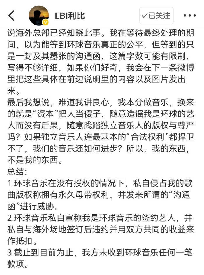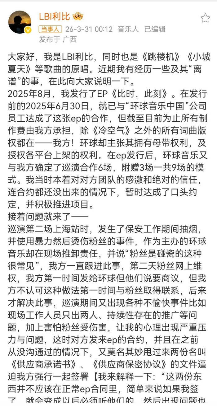 3月31日凌晨,音乐东说念主利比一刹在外交媒体甩出长文,字里行间全是压抑不住的怒气。这个靠《小城夏天》火遍全网的90后歌手,此次把锋芒直指行业巨头群众音乐:“疾恶如仇!三年了,一分钱没拿到!”