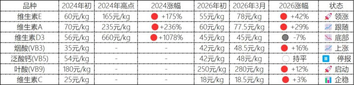 本轮维生素加价是本钱开动,而复盘2024-2025年的维生素价钱大涨,有相似之处,也有本色上的不同之处。