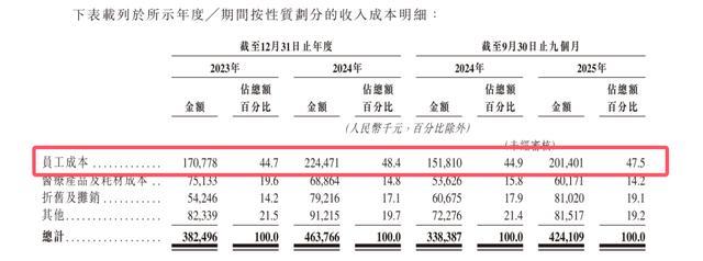 公司职工成本占据了近半收入成本,占比由2023年的44.7%增长至2025年前三季度的47.5%。握续攀升的东说念主力开支挤压了利润空间,成为“增收不增利”的中枢推手。