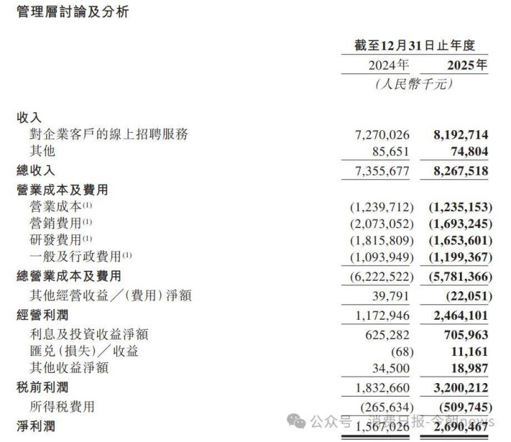 而当作招聘市集中坚群体的中型客户(年付费5000元-5万元),收入仅同比增长4.8%,其收入占比也从2024年的34.6%下落至2025年的32.2%。