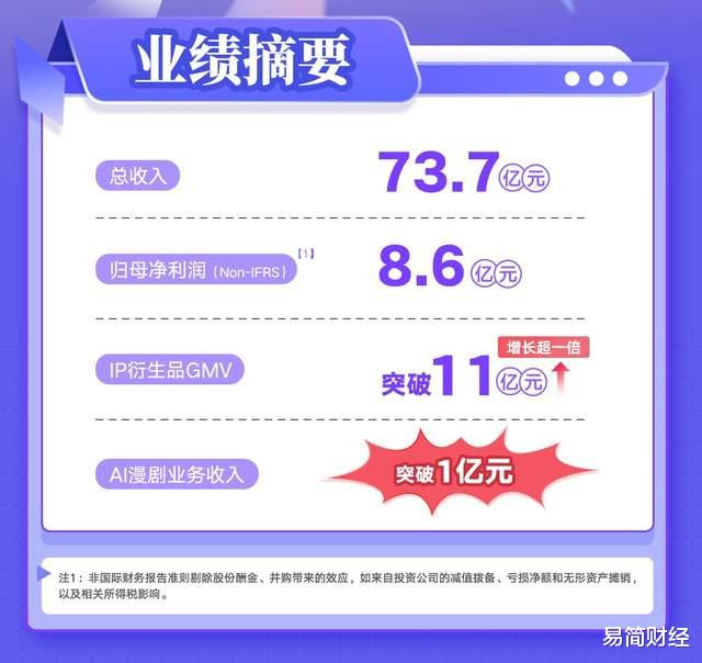 3月17日,阅文集团(股票代码:00772.HK)发布2025年全年财报。数据炫耀,2025年阅文终了营业收入73.7亿元,Non-IFRS归母净利润8.6亿元。在“IP+AI”策略率领下,阅文的AI漫剧、短剧、IP繁衍品等新业态终了多元突破,其中AI漫剧收入呈爆发式增长,突破亿元大关;IP繁衍品GMV同比增长超一倍,突破11亿元。